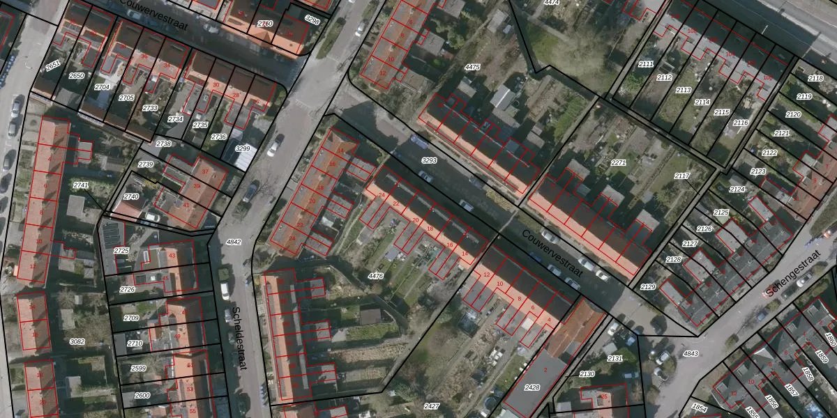 Het perceel waarop Couwervestraat 20 staat heeft een oppervlakte van 2540 m². Dit is een zeer groot perceel. De perceeloppervlakte wordt geregistreerd door het Kadaster. Gedetailleerde informatie over de maten van dit perceel kunt u vinden in het rapport Kadastrale kaart met maatvoering van Couwervestraat 20.