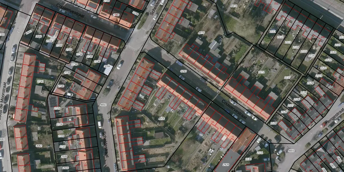 Het perceel waarop Couwervestraat 22 staat heeft een oppervlakte van 2540 m². Dit is een zeer groot perceel. De perceeloppervlakte wordt geregistreerd door het Kadaster. Gedetailleerde informatie over de maten van dit perceel kunt u vinden in het rapport Kadastrale kaart met maatvoering van Couwervestraat 22.