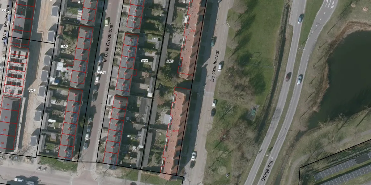 Het perceel waarop De Graaffstraat 25 staat heeft een oppervlakte van 2045 m². Dit is een zeer groot perceel. De perceeloppervlakte wordt geregistreerd door het Kadaster. Gedetailleerde informatie over de maten van dit perceel kunt u vinden in het rapport Kadastrale kaart met maatvoering van De Graaffstraat 25.