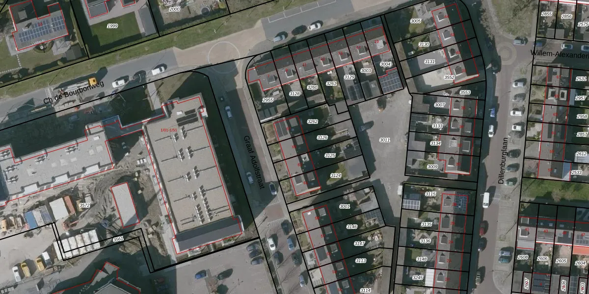 Gebruik de zoekbalk of klik op een perceel voor informatie over de adressen binnen dit perceel.
