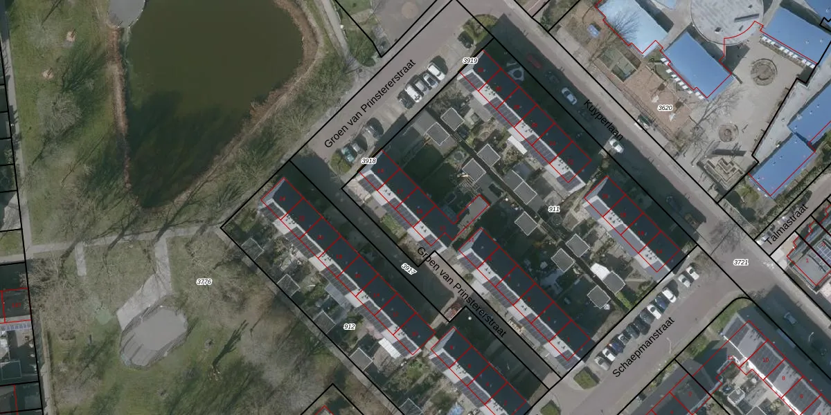 Het perceel waarop Groen van Prinstererstraat 15 staat heeft een oppervlakte van 3365 m². Dit is een zeer groot perceel. De perceeloppervlakte wordt geregistreerd door het Kadaster. Gedetailleerde informatie over de maten van dit perceel kunt u vinden in het rapport Kadastrale kaart met maatvoering van Groen van Prinstererstraat 15.