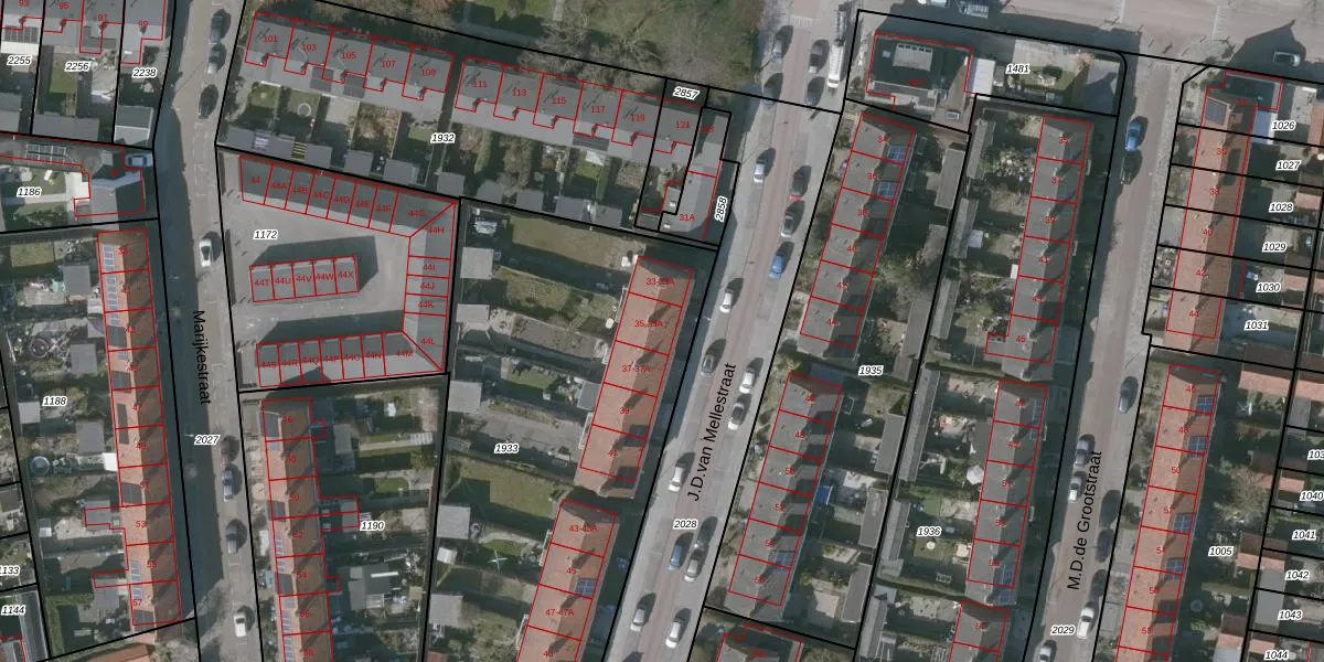 Het perceel waarop J.D.van Mellestraat 35 staat heeft een oppervlakte van 2419 m². Dit is een zeer groot perceel. De perceeloppervlakte wordt geregistreerd door het Kadaster. Gedetailleerde informatie over de maten van dit perceel kunt u vinden in het rapport Kadastrale kaart met maatvoering van J.D.van Mellestraat 35.