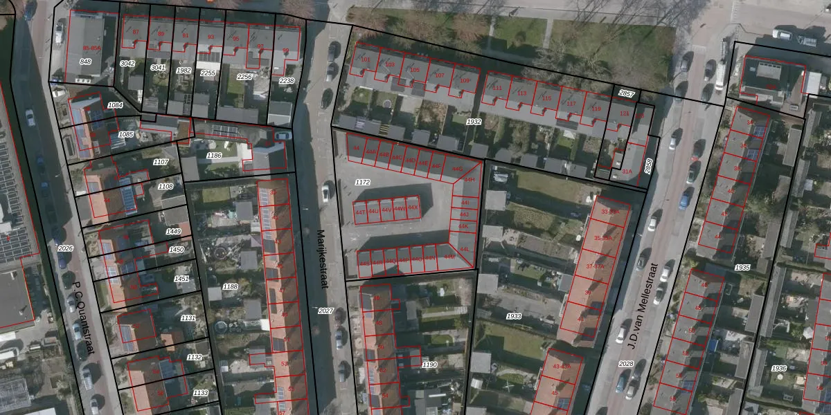 Het perceel waarop Marijkestraat 44-X staat heeft een oppervlakte van 1090 m². Dit is een zeer groot perceel. De perceeloppervlakte wordt geregistreerd door het Kadaster. Gedetailleerde informatie over de maten van dit perceel kunt u vinden in het rapport Kadastrale kaart met maatvoering van Marijkestraat 44-X.