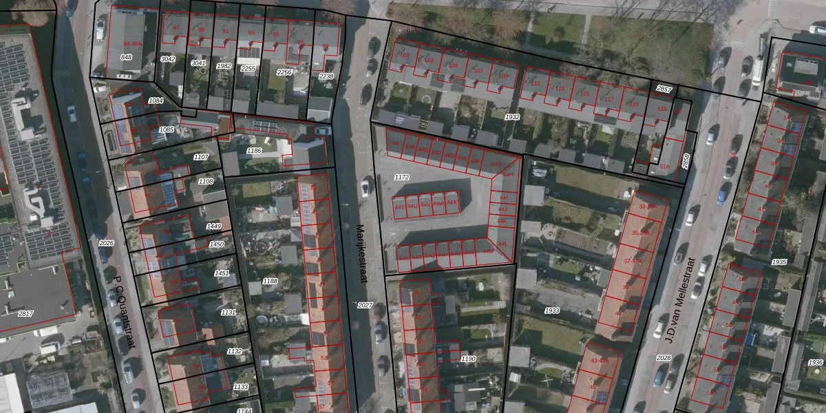 Het perceel waarop Marijkestraat 44-U staat heeft een oppervlakte van 1090 m². Dit is een zeer groot perceel. De perceeloppervlakte wordt geregistreerd door het Kadaster. Gedetailleerde informatie over de maten van dit perceel kunt u vinden in het rapport Kadastrale kaart met maatvoering van Marijkestraat 44-U.