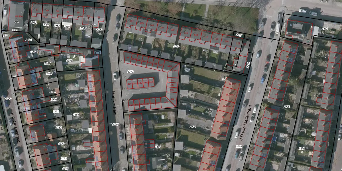 Het perceel waarop Marijkestraat 44-J staat heeft een oppervlakte van 1090 m². Dit is een zeer groot perceel. De perceeloppervlakte wordt geregistreerd door het Kadaster. Gedetailleerde informatie over de maten van dit perceel kunt u vinden in het rapport Kadastrale kaart met maatvoering van Marijkestraat 44-J.