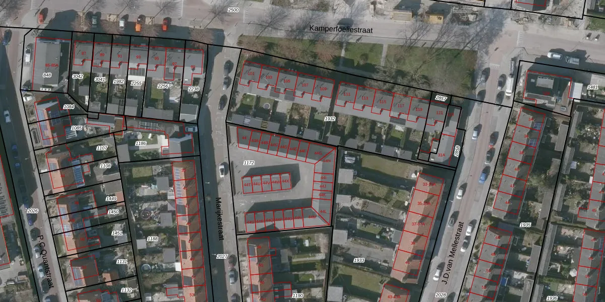 Het perceel waarop Marijkestraat 44-F staat heeft een oppervlakte van 1090 m². Dit is een zeer groot perceel. De perceeloppervlakte wordt geregistreerd door het Kadaster. Gedetailleerde informatie over de maten van dit perceel kunt u vinden in het rapport Kadastrale kaart met maatvoering van Marijkestraat 44-F.