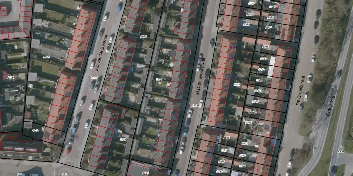 Het perceel waarop M.D.de Grootstraat 55 staat heeft een oppervlakte van 2713 m². Dit is een zeer groot perceel. De perceeloppervlakte wordt geregistreerd door het Kadaster. Gedetailleerde informatie over de maten van dit perceel kunt u vinden in het rapport Kadastrale kaart met maatvoering van M.D.de Grootstraat 55.