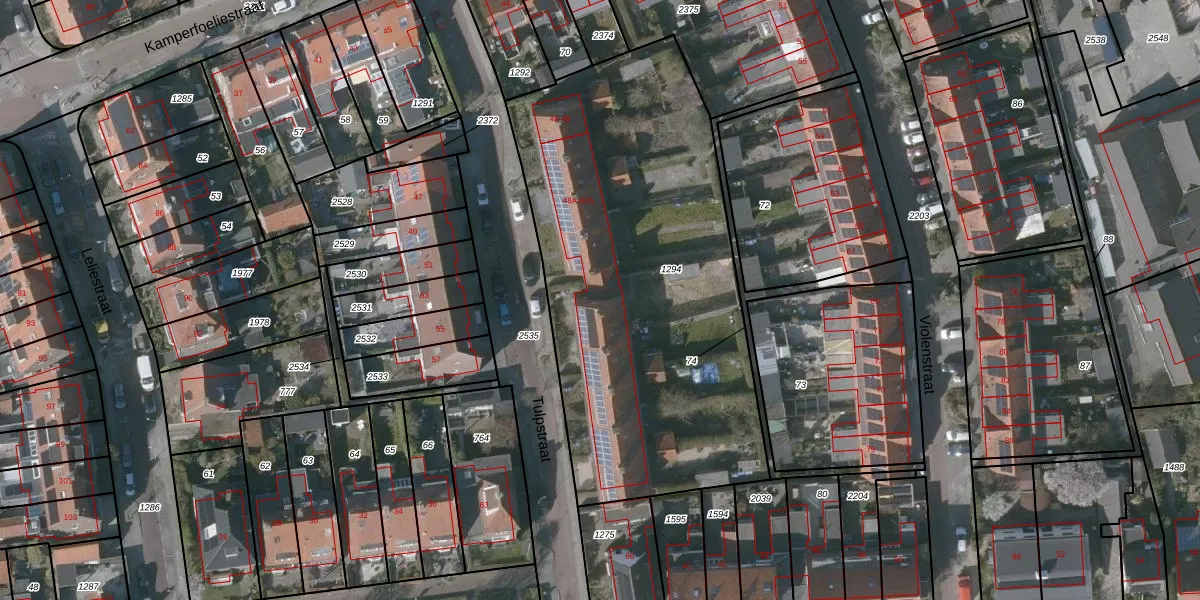 Het perceel waarop Tulpstraat 54 staat heeft een oppervlakte van 2291 m². Dit is een zeer groot perceel. De perceeloppervlakte wordt geregistreerd door het Kadaster. Gedetailleerde informatie over de maten van dit perceel kunt u vinden in het rapport Kadastrale kaart met maatvoering van Tulpstraat 54.