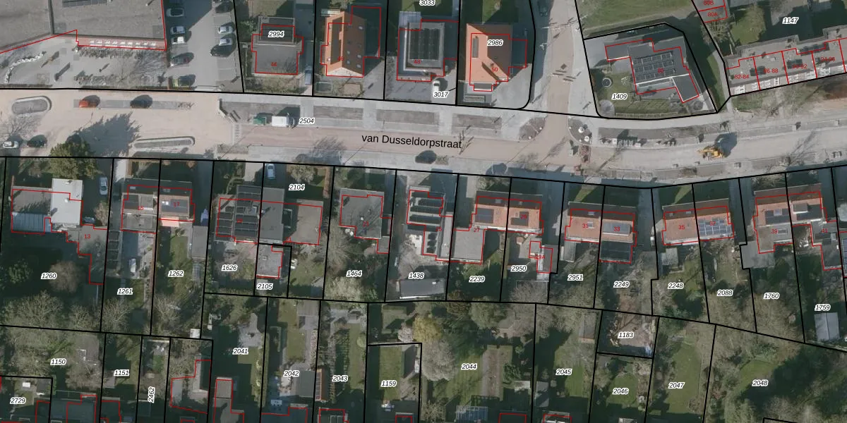 Het perceel waarop van Dusseldorpstraat 25 staat heeft een oppervlakte van 443 m². Dit is een groot perceel. De perceeloppervlakte wordt geregistreerd door het Kadaster. Gedetailleerde informatie over de maten van dit perceel kunt u vinden in het rapport Kadastrale kaart met maatvoering van van Dusseldorpstraat 25.