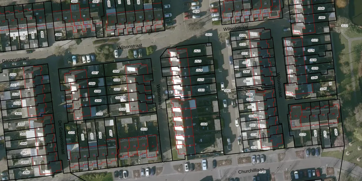 Het perceel waarop Wilsonstraat 13 staat heeft een oppervlakte van 165 m². Dit is een middelgroot perceel. De perceeloppervlakte wordt geregistreerd door het Kadaster. Gedetailleerde informatie over de maten van dit perceel kunt u vinden in het rapport Kadastrale kaart met maatvoering van Wilsonstraat 13.