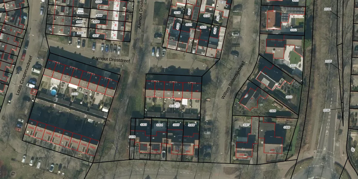 Het perceel waarop Aarnout Drostdreef 56 staat heeft een oppervlakte van 757 m². Dit is een groot perceel. De perceeloppervlakte wordt geregistreerd door het Kadaster. Gedetailleerde informatie over de maten van dit perceel kunt u vinden in het rapport Kadastrale kaart met maatvoering van Aarnout Drostdreef 56.