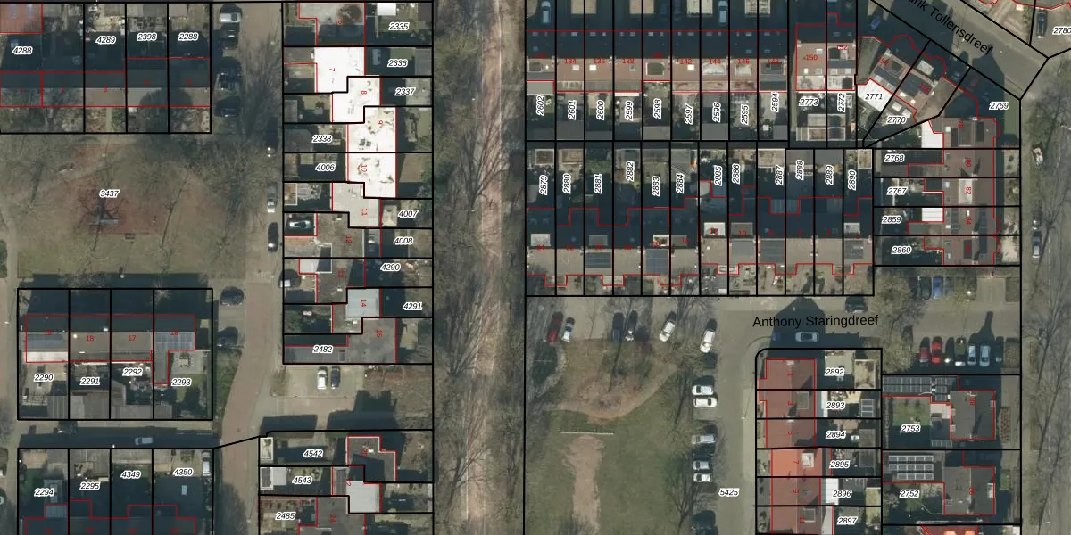 Het perceel waarop Anthony Staringdreef 24 staat heeft een oppervlakte van 163 m². Dit is een middelgroot perceel. De perceeloppervlakte wordt geregistreerd door het Kadaster. Gedetailleerde informatie over de maten van dit perceel kunt u vinden in het rapport Kadastrale kaart met maatvoering van Anthony Staringdreef 24.