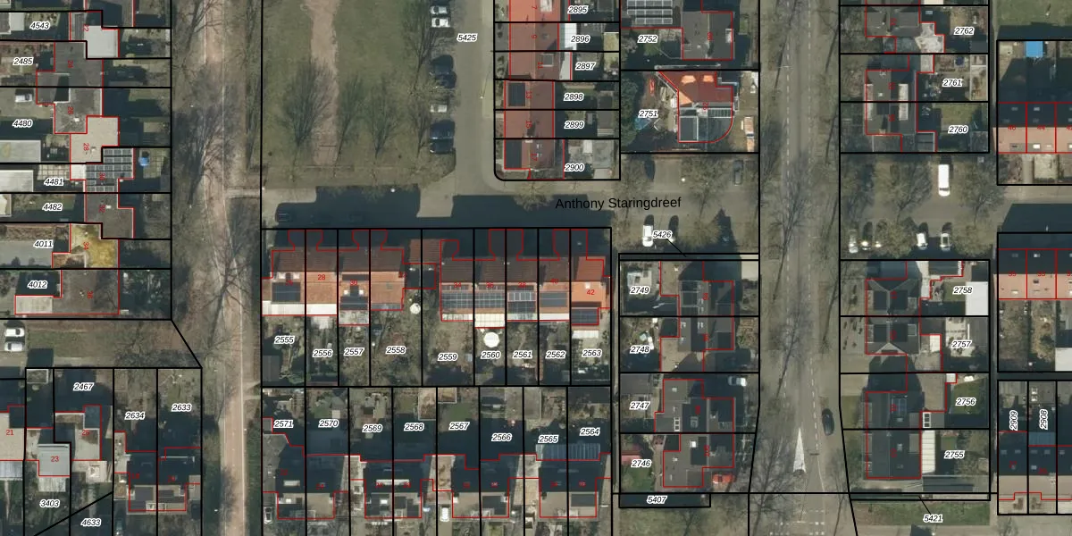Anthony Staringdreef 38 is gelegen op kadastraal perceel GLE01A2561. Deze kadastrale aanduiding is uniek en wordt gebruikt door het Kadaster om eigendomsrechten en andere zakelijke rechten vast te leggen. Het perceel maakt onderdeel uit van de kadastrale gemeente Goirle.