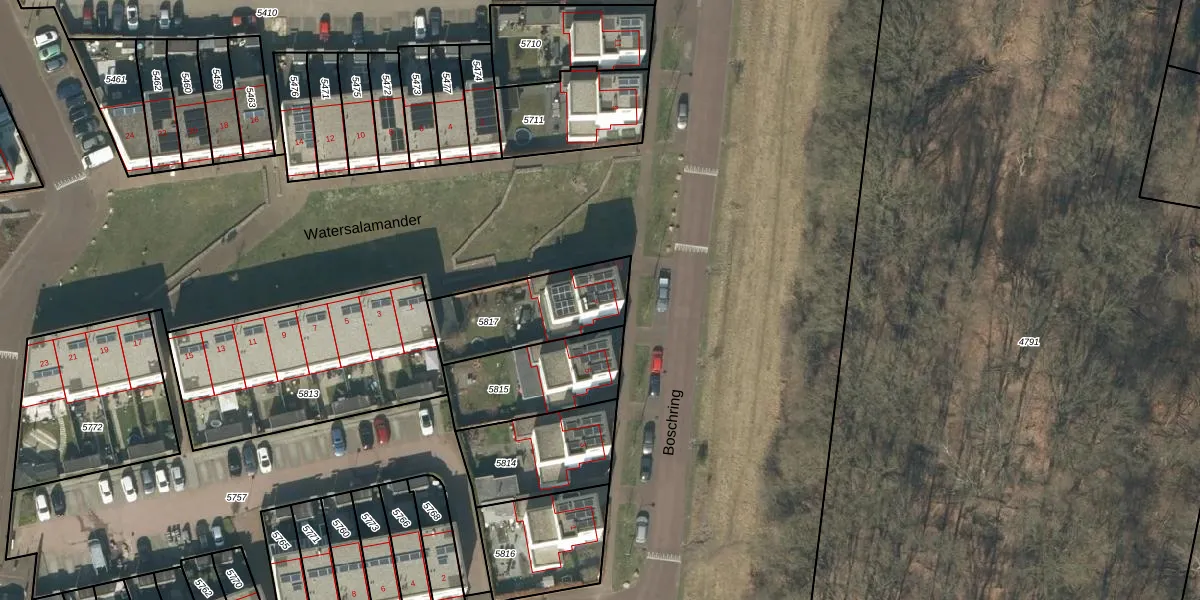 Het perceel waarop Boschring 7 staat heeft een oppervlakte van 365 m². Dit is een groot perceel. De perceeloppervlakte wordt geregistreerd door het Kadaster. Gedetailleerde informatie over de maten van dit perceel kunt u vinden in het rapport Kadastrale kaart met maatvoering van Boschring 7.
