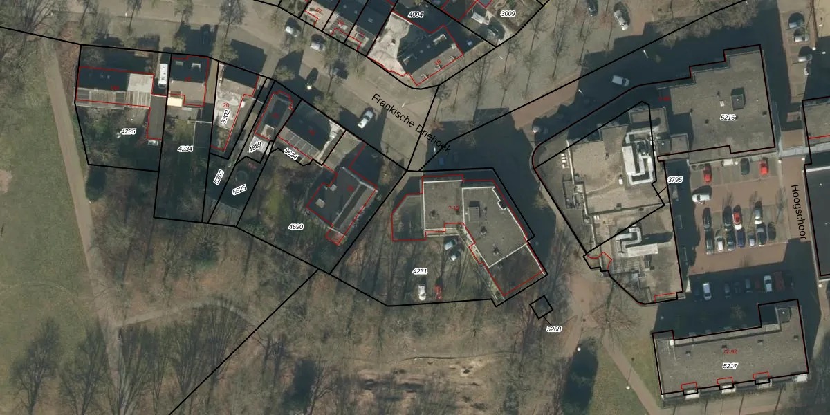 Het perceel waarop Frankische Driehoek 15-02 staat heeft een oppervlakte van 1204 m². Dit is een zeer groot perceel. De perceeloppervlakte wordt geregistreerd door het Kadaster. Gedetailleerde informatie over de maten van dit perceel kunt u vinden in het rapport Kadastrale kaart met maatvoering van Frankische Driehoek 15-02.