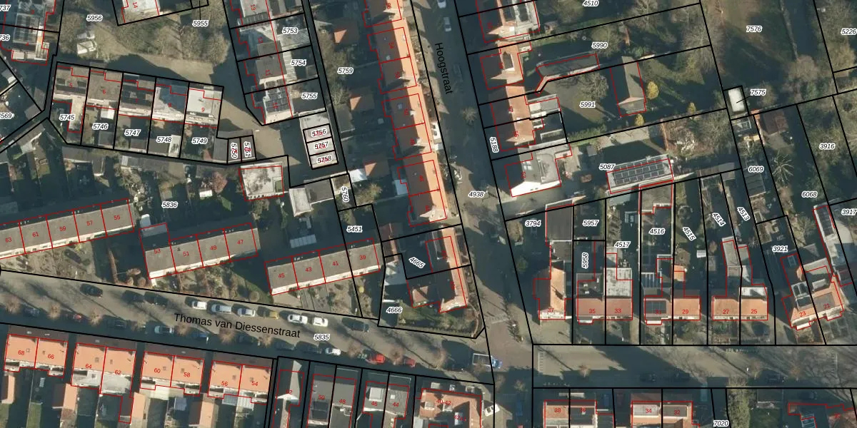 Hoogstraat 44 is gelegen op kadastraal perceel GLE01B5759. Deze kadastrale aanduiding is uniek en wordt gebruikt door het Kadaster om eigendomsrechten en andere zakelijke rechten vast te leggen. Het perceel maakt onderdeel uit van de kadastrale gemeente Goirle.