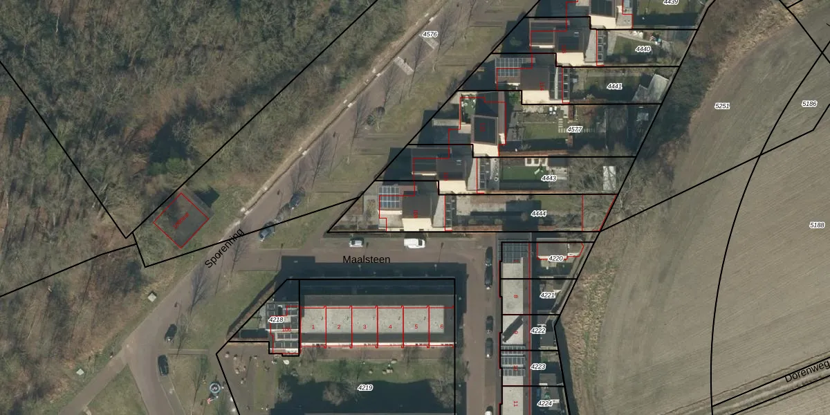 Het perceel waarop Sporenring 108 staat heeft een oppervlakte van 630 m². Dit is een groot perceel. De perceeloppervlakte wordt geregistreerd door het Kadaster. Gedetailleerde informatie over de maten van dit perceel kunt u vinden in het rapport Kadastrale kaart met maatvoering van Sporenring 108.