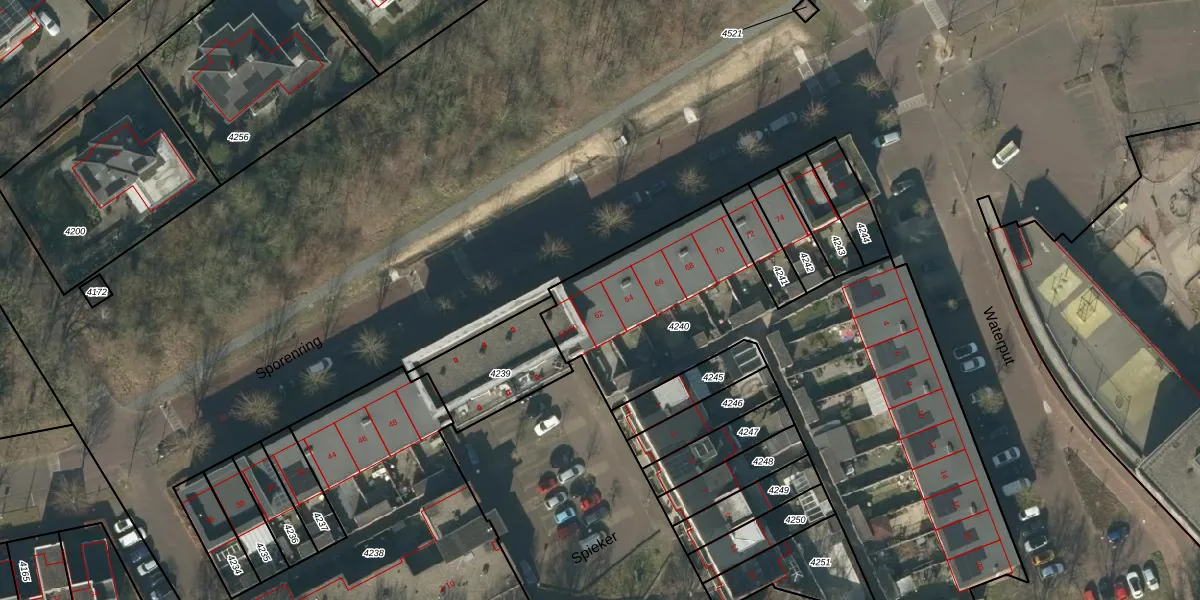 Het perceel waarop Sporenring 62 staat heeft een oppervlakte van 2250 m². Dit is een zeer groot perceel. De perceeloppervlakte wordt geregistreerd door het Kadaster. Gedetailleerde informatie over de maten van dit perceel kunt u vinden in het rapport Kadastrale kaart met maatvoering van Sporenring 62.