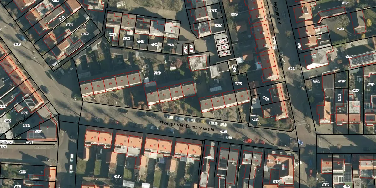Het perceel waarop Thomas van Diessenstraat 47 staat heeft een oppervlakte van 2636 m². Dit is een zeer groot perceel. De perceeloppervlakte wordt geregistreerd door het Kadaster. Gedetailleerde informatie over de maten van dit perceel kunt u vinden in het rapport Kadastrale kaart met maatvoering van Thomas van Diessenstraat 47.