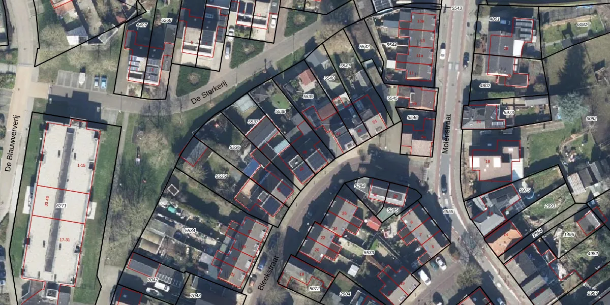 Het perceel waarop Bleekstraat 45 staat heeft een oppervlakte van 290 m². Dit is een middelgroot perceel. De perceeloppervlakte wordt geregistreerd door het Kadaster. Gedetailleerde informatie over de maten van dit perceel kunt u vinden in het rapport Kadastrale kaart met maatvoering van Bleekstraat 45.