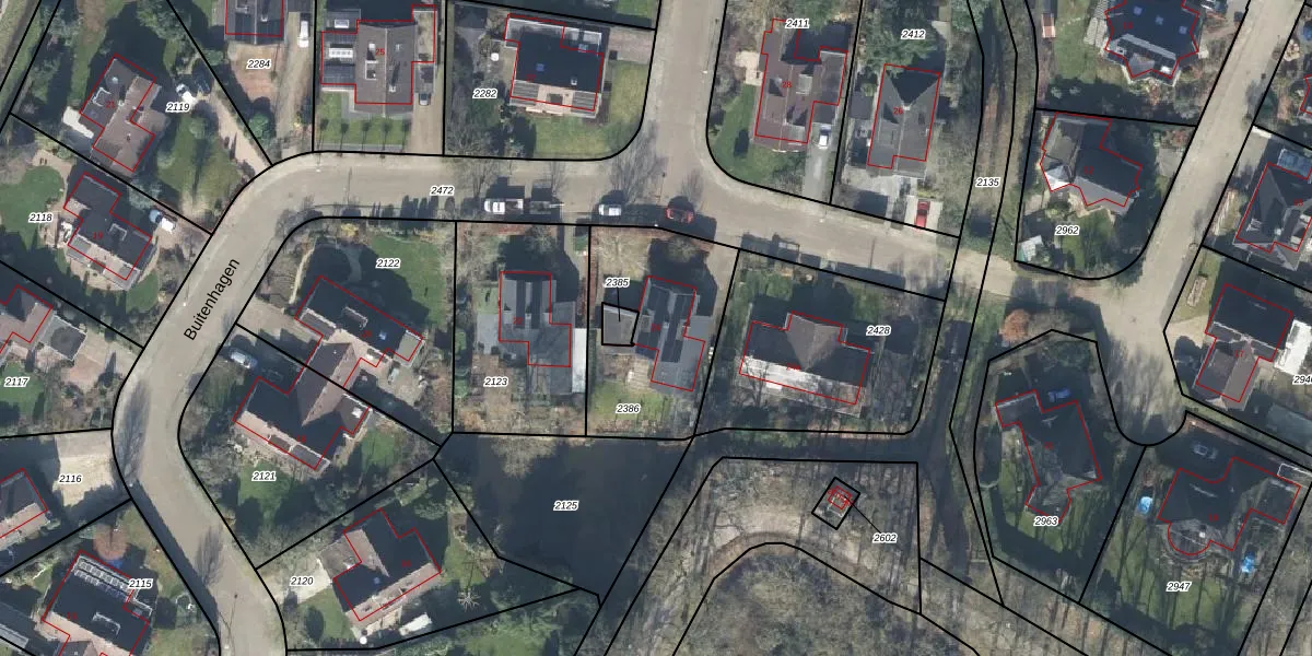 Het perceel waarop Buitenhagen 24 staat heeft een oppervlakte van 591 m². Dit is een groot perceel. De perceeloppervlakte wordt geregistreerd door het Kadaster. Gedetailleerde informatie over de maten van dit perceel kunt u vinden in het rapport Kadastrale kaart met maatvoering van Buitenhagen 24.