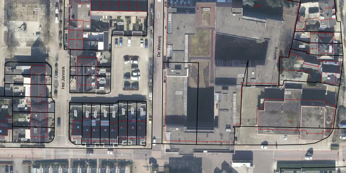 Het perceel waarop De Weverij 60 staat heeft een oppervlakte van 963 m². Dit is een groot perceel. De perceeloppervlakte wordt geregistreerd door het Kadaster. Gedetailleerde informatie over de maten van dit perceel kunt u vinden in het rapport Kadastrale kaart met maatvoering van De Weverij 60.