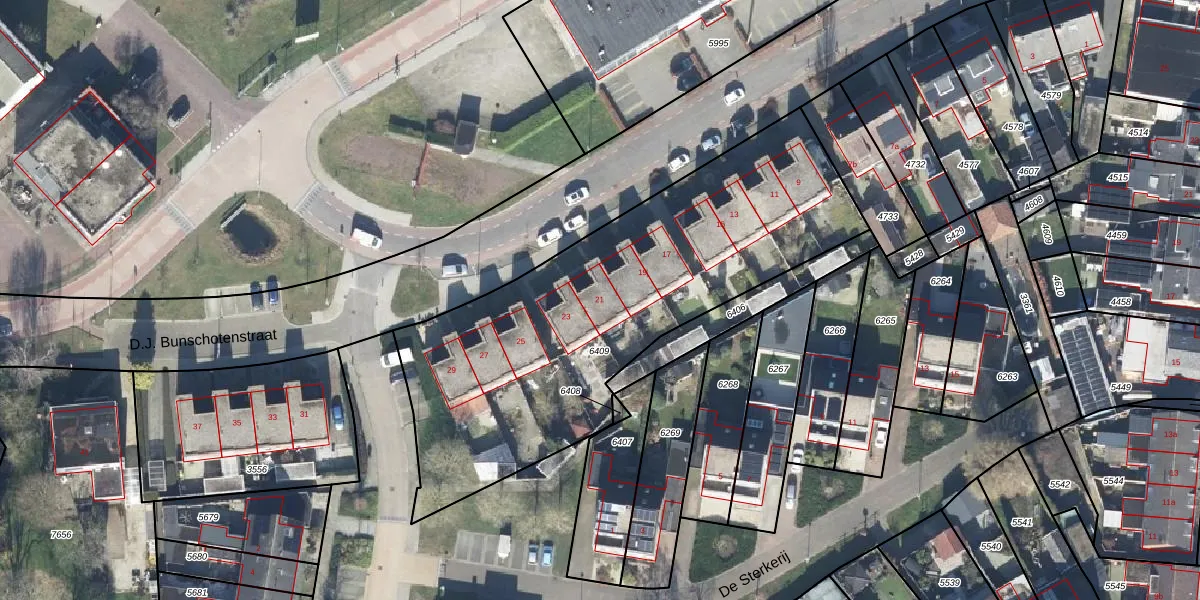 Het perceel waarop D.J. Bunschotenstraat 21 staat heeft een oppervlakte van 2032 m². Dit is een zeer groot perceel. De perceeloppervlakte wordt geregistreerd door het Kadaster. Gedetailleerde informatie over de maten van dit perceel kunt u vinden in het rapport Kadastrale kaart met maatvoering van D.J. Bunschotenstraat 21.