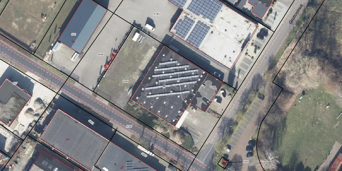 Het perceel waarop Gruttostraat 75 staat heeft een oppervlakte van 3245 m². Dit is een zeer groot perceel. De perceeloppervlakte wordt geregistreerd door het Kadaster. Gedetailleerde informatie over de maten van dit perceel kunt u vinden in het rapport Kadastrale kaart met maatvoering van Gruttostraat 75.