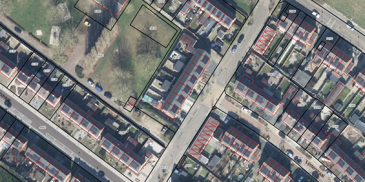 Het perceel waarop Gruttostraat 9 staat heeft een oppervlakte van 2195 m². Dit is een zeer groot perceel. De perceeloppervlakte wordt geregistreerd door het Kadaster. Gedetailleerde informatie over de maten van dit perceel kunt u vinden in het rapport Kadastrale kaart met maatvoering van Gruttostraat 9.