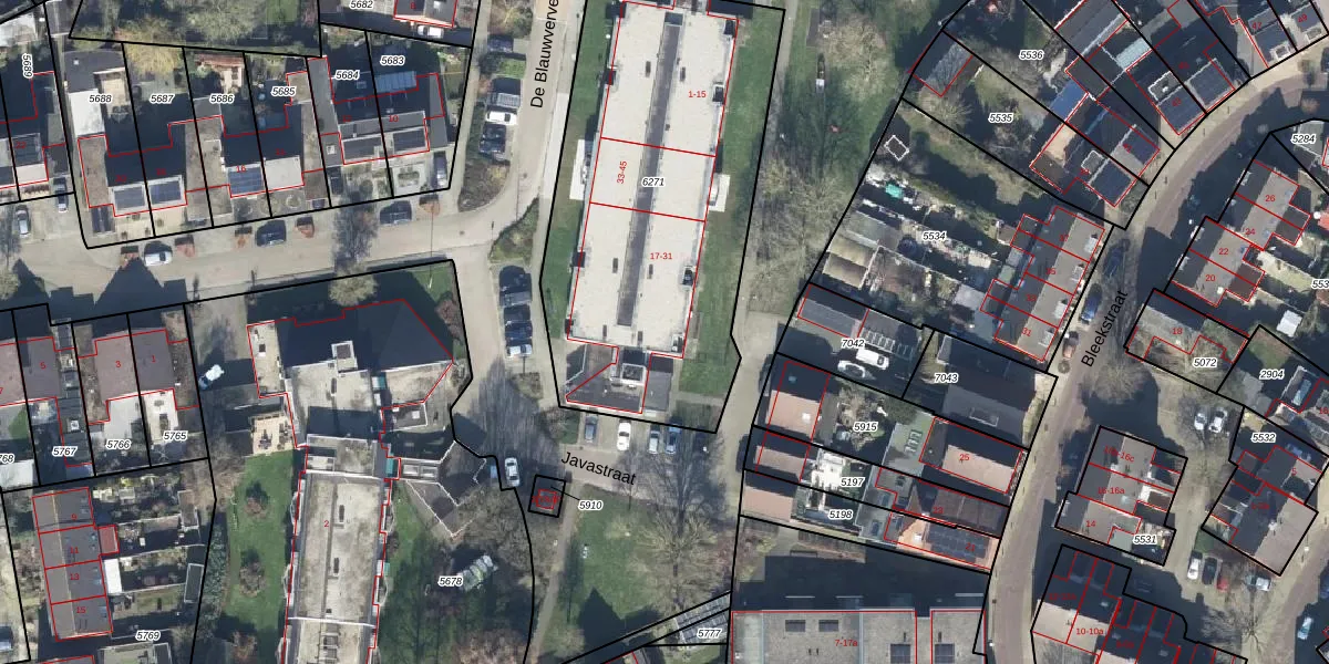 Het perceel waarop Javastraat 1 staat heeft een oppervlakte van 1872 m². Dit is een zeer groot perceel. De perceeloppervlakte wordt geregistreerd door het Kadaster. Gedetailleerde informatie over de maten van dit perceel kunt u vinden in het rapport Kadastrale kaart met maatvoering van Javastraat 1.