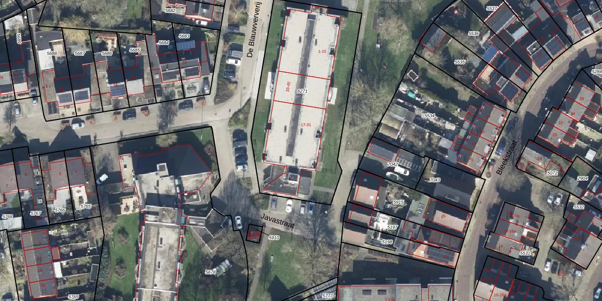 Het perceel waarop Javastraat 17 staat heeft een oppervlakte van 1872 m². Dit is een zeer groot perceel. De perceeloppervlakte wordt geregistreerd door het Kadaster. Gedetailleerde informatie over de maten van dit perceel kunt u vinden in het rapport Kadastrale kaart met maatvoering van Javastraat 17.