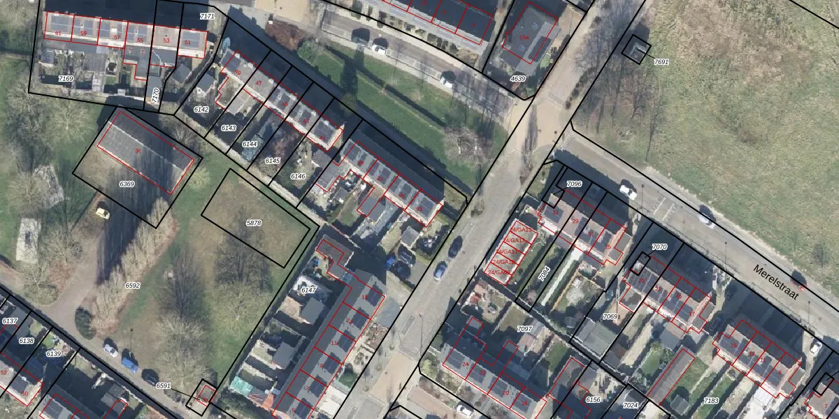 Het perceel waarop Merelstraat 33 staat heeft een oppervlakte van 2195 m². Dit is een zeer groot perceel. De perceeloppervlakte wordt geregistreerd door het Kadaster. Gedetailleerde informatie over de maten van dit perceel kunt u vinden in het rapport Kadastrale kaart met maatvoering van Merelstraat 33.