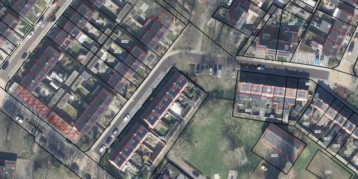 Het perceel waarop Merelstraat 63 staat heeft een oppervlakte van 1865 m². Dit is een zeer groot perceel. De perceeloppervlakte wordt geregistreerd door het Kadaster. Gedetailleerde informatie over de maten van dit perceel kunt u vinden in het rapport Kadastrale kaart met maatvoering van Merelstraat 63.
