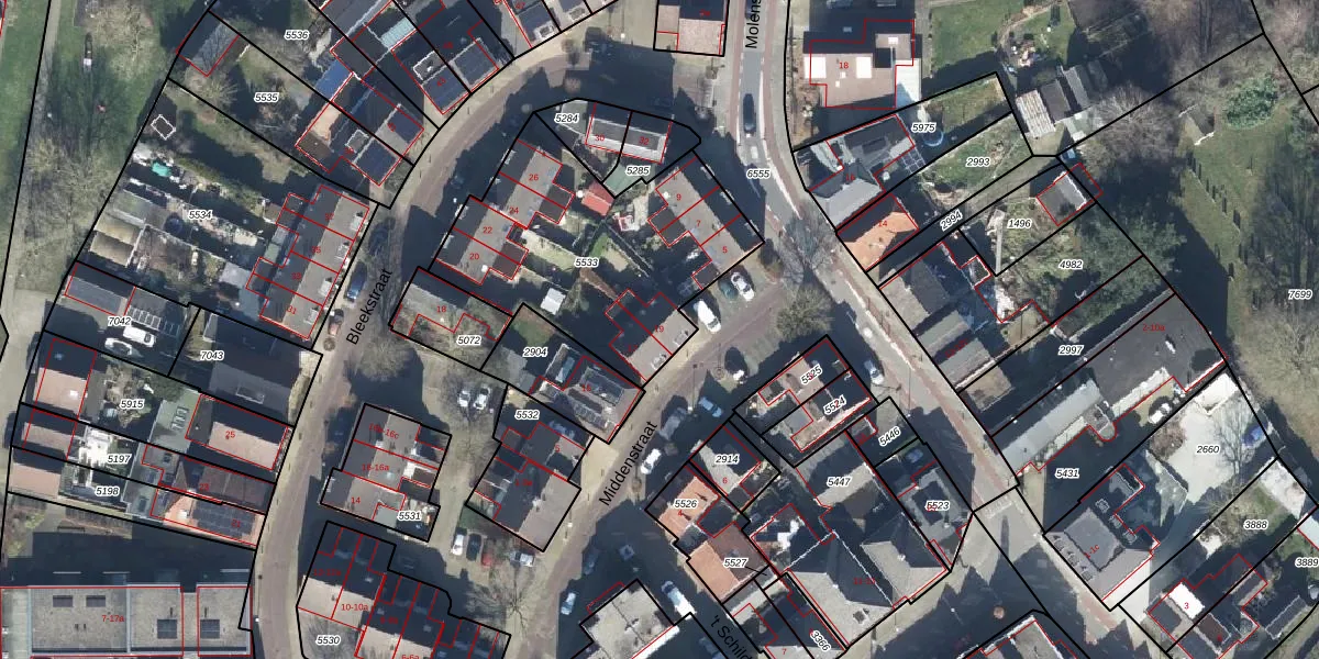Het perceel waarop Middenstraat 19 staat heeft een oppervlakte van 1057 m². Dit is een zeer groot perceel. De perceeloppervlakte wordt geregistreerd door het Kadaster. Gedetailleerde informatie over de maten van dit perceel kunt u vinden in het rapport Kadastrale kaart met maatvoering van Middenstraat 19.