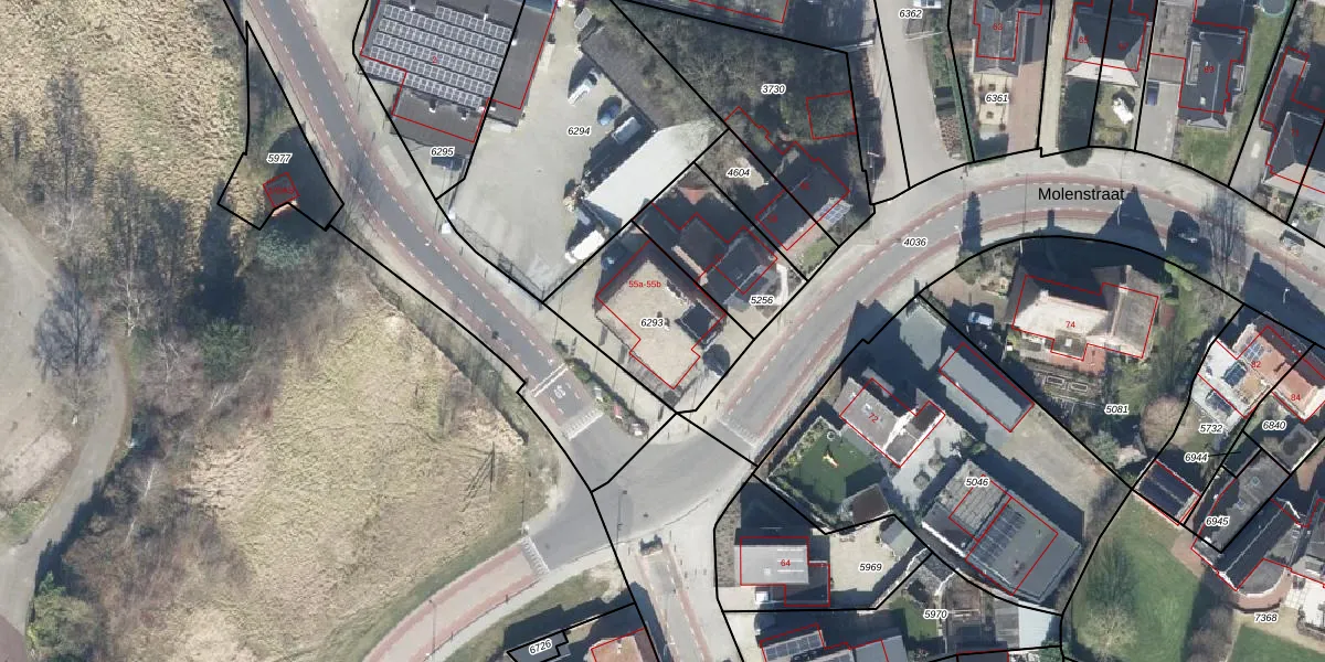 Molenstraat 55-b is gelegen op kadastraal perceel GOO00C6293. Deze kadastrale aanduiding is uniek en wordt gebruikt door het Kadaster om eigendomsrechten en andere zakelijke rechten vast te leggen. Het perceel maakt onderdeel uit van de kadastrale gemeente Goor.