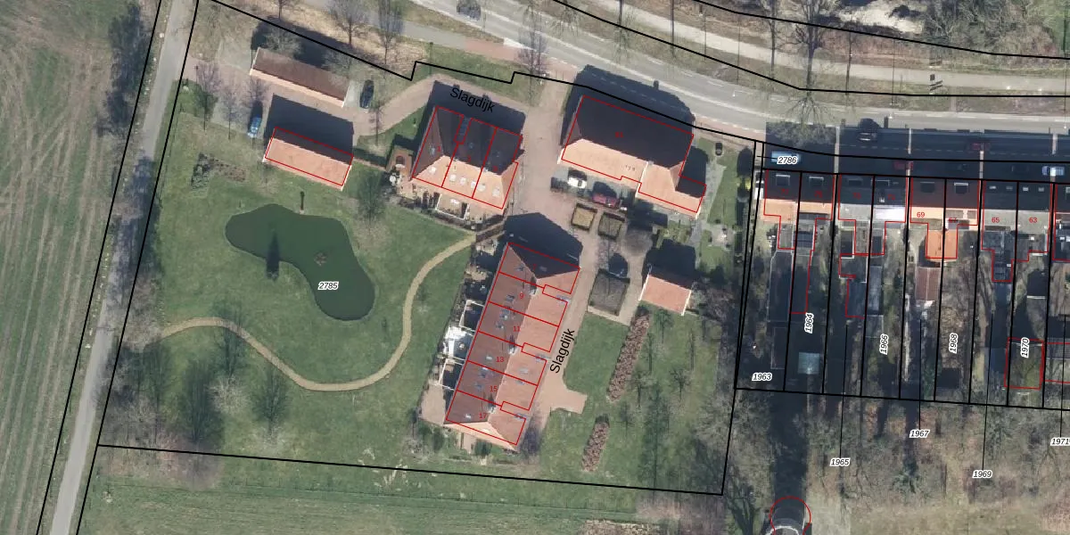 Het perceel waarop Slagdijk 7 staat heeft een oppervlakte van 8291 m². Dit is een zeer groot perceel. De perceeloppervlakte wordt geregistreerd door het Kadaster. Gedetailleerde informatie over de maten van dit perceel kunt u vinden in het rapport Kadastrale kaart met maatvoering van Slagdijk 7.