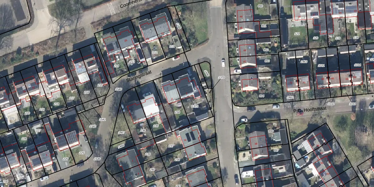 Staringstraat 1 is gelegen op kadastraal perceel GOO00D1372. Deze kadastrale aanduiding is uniek en wordt gebruikt door het Kadaster om eigendomsrechten en andere zakelijke rechten vast te leggen. Het perceel maakt onderdeel uit van de kadastrale gemeente Goor.