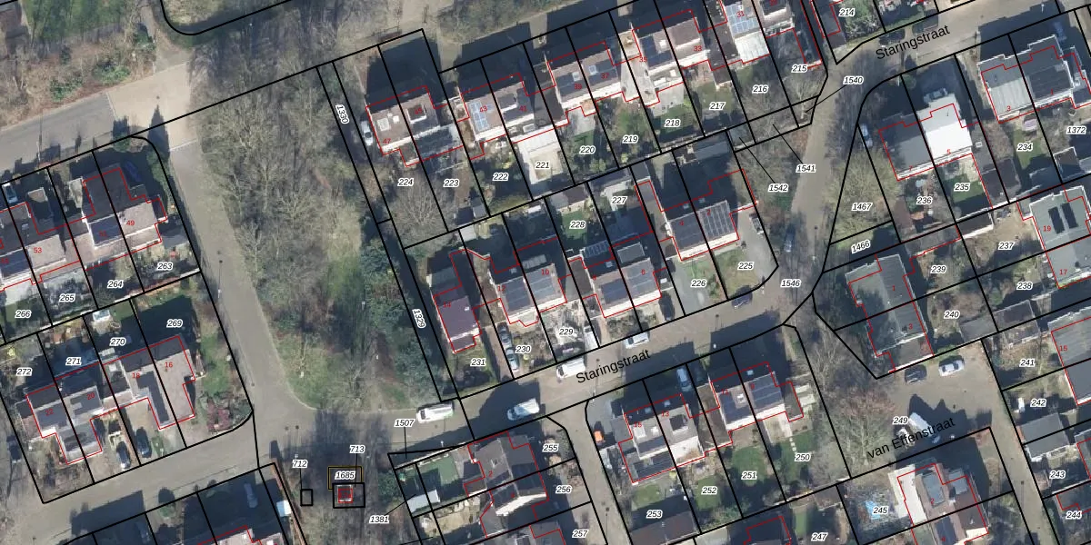 Het perceel waarop Staringstraat 10 staat heeft een oppervlakte van 247 m². Dit is een middelgroot perceel. De perceeloppervlakte wordt geregistreerd door het Kadaster. Gedetailleerde informatie over de maten van dit perceel kunt u vinden in het rapport Kadastrale kaart met maatvoering van Staringstraat 10.