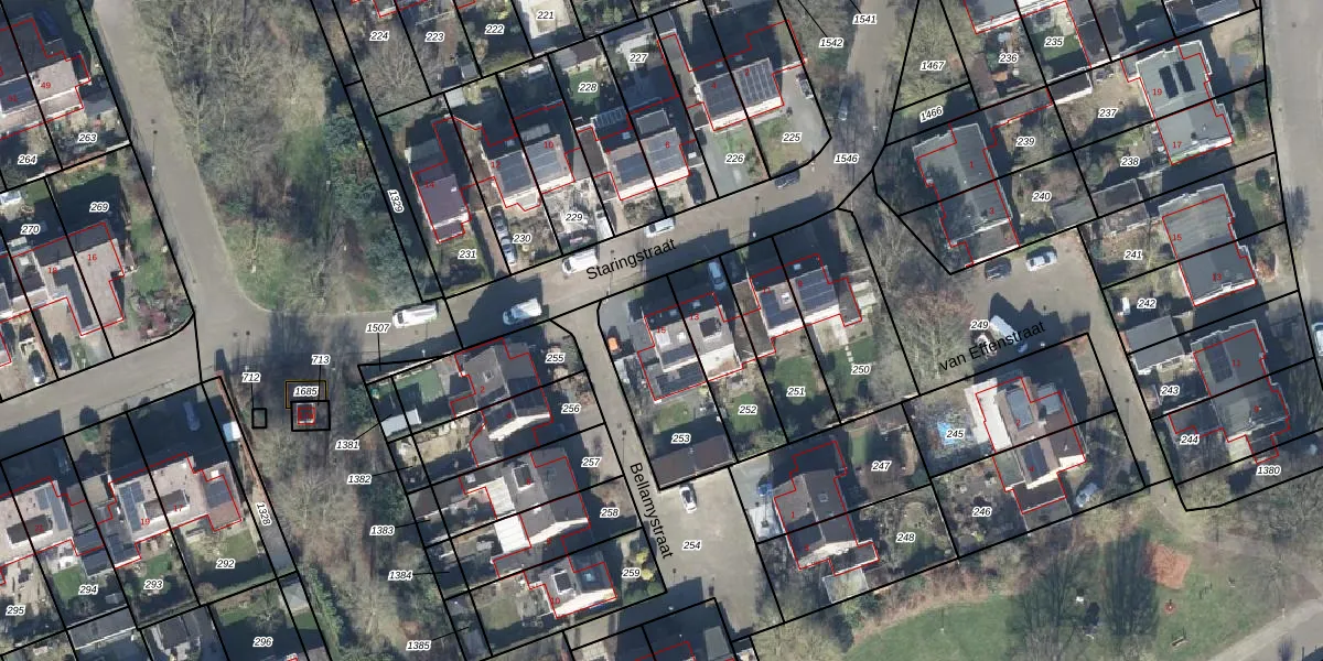 Het perceel waarop Staringstraat 15 staat heeft een oppervlakte van 380 m². Dit is een groot perceel. De perceeloppervlakte wordt geregistreerd door het Kadaster. Gedetailleerde informatie over de maten van dit perceel kunt u vinden in het rapport Kadastrale kaart met maatvoering van Staringstraat 15.