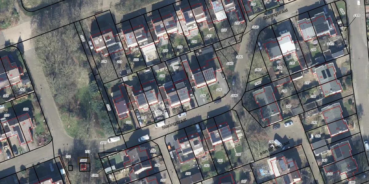 Het perceel waarop Staringstraat 6 staat heeft een oppervlakte van 247 m². Dit is een middelgroot perceel. De perceeloppervlakte wordt geregistreerd door het Kadaster. Gedetailleerde informatie over de maten van dit perceel kunt u vinden in het rapport Kadastrale kaart met maatvoering van Staringstraat 6.