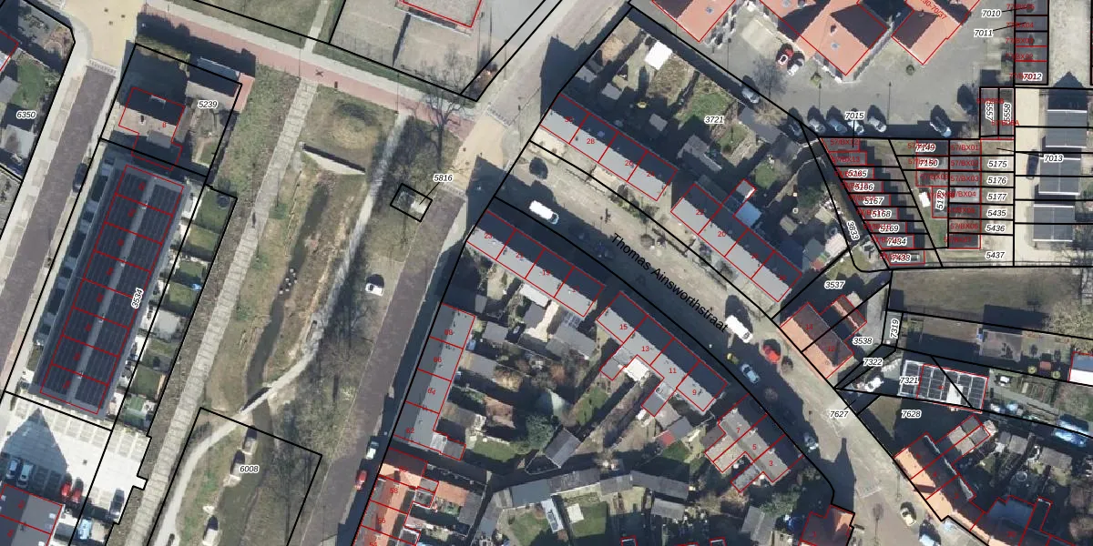 Het perceel waarop Thomas Ainsworthstraat 19 staat heeft een oppervlakte van 9347 m². Dit is een zeer groot perceel. De perceeloppervlakte wordt geregistreerd door het Kadaster. Gedetailleerde informatie over de maten van dit perceel kunt u vinden in het rapport Kadastrale kaart met maatvoering van Thomas Ainsworthstraat 19.