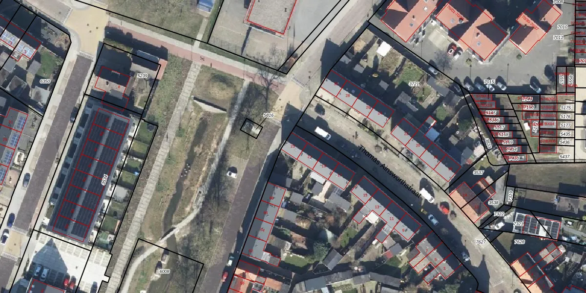 Het perceel waarop Thomas Ainsworthstraat 23 staat heeft een oppervlakte van 9347 m². Dit is een zeer groot perceel. De perceeloppervlakte wordt geregistreerd door het Kadaster. Gedetailleerde informatie over de maten van dit perceel kunt u vinden in het rapport Kadastrale kaart met maatvoering van Thomas Ainsworthstraat 23.