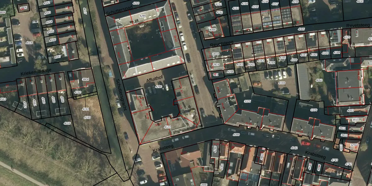 Affuithof 7 is gelegen op kadastraal perceel GRC00D4121. Deze kadastrale aanduiding is uniek en wordt gebruikt door het Kadaster om eigendomsrechten en andere zakelijke rechten vast te leggen. Het perceel maakt onderdeel uit van de kadastrale gemeente Gorinchem.