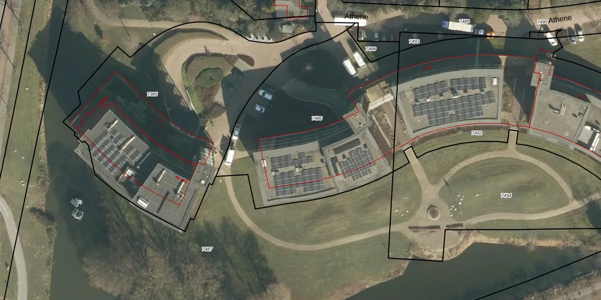 Het perceel waarop Athene 59 staat heeft een oppervlakte van 2395 m². Dit is een zeer groot perceel. De perceeloppervlakte wordt geregistreerd door het Kadaster. Gedetailleerde informatie over de maten van dit perceel kunt u vinden in het rapport Kadastrale kaart met maatvoering van Athene 59.