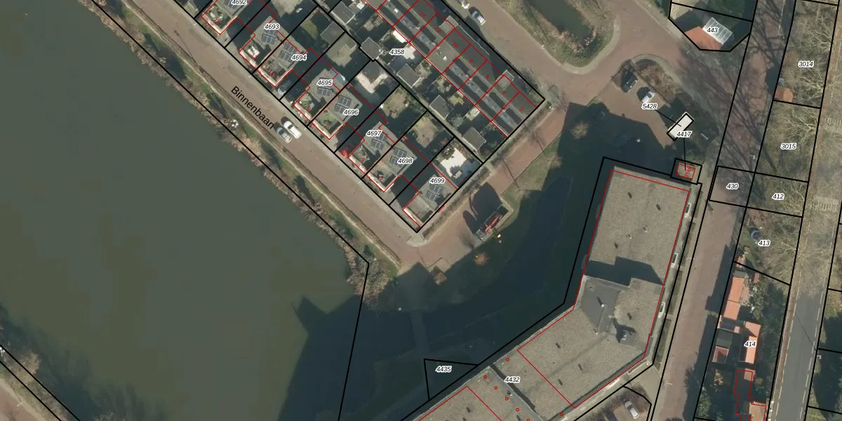 Binnenbaan 1 is gelegen op kadastraal perceel GRC00F4699. Deze kadastrale aanduiding is uniek en wordt gebruikt door het Kadaster om eigendomsrechten en andere zakelijke rechten vast te leggen. Het perceel maakt onderdeel uit van de kadastrale gemeente Gorinchem.