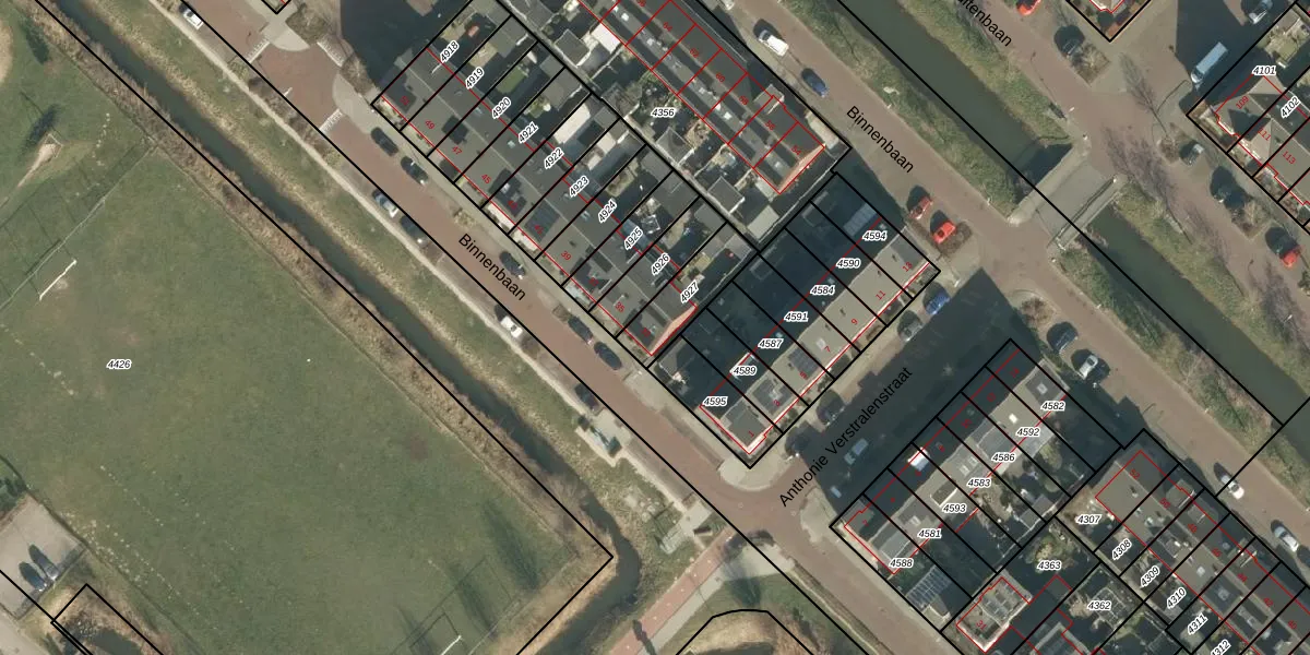 Het perceel waarop Binnenbaan 33 staat heeft een oppervlakte van 166 m². Dit is een middelgroot perceel. De perceeloppervlakte wordt geregistreerd door het Kadaster. Gedetailleerde informatie over de maten van dit perceel kunt u vinden in het rapport Kadastrale kaart met maatvoering van Binnenbaan 33.