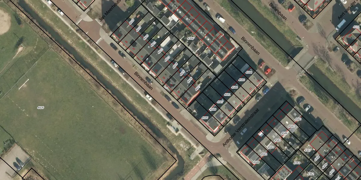 Het perceel waarop Binnenbaan 35 staat heeft een oppervlakte van 142 m². Dit is een middelgroot perceel. De perceeloppervlakte wordt geregistreerd door het Kadaster. Gedetailleerde informatie over de maten van dit perceel kunt u vinden in het rapport Kadastrale kaart met maatvoering van Binnenbaan 35.
