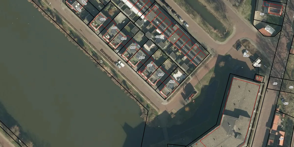 Binnenbaan 5 is gelegen op kadastraal perceel GRC00F4697. Deze kadastrale aanduiding is uniek en wordt gebruikt door het Kadaster om eigendomsrechten en andere zakelijke rechten vast te leggen. Het perceel maakt onderdeel uit van de kadastrale gemeente Gorinchem.