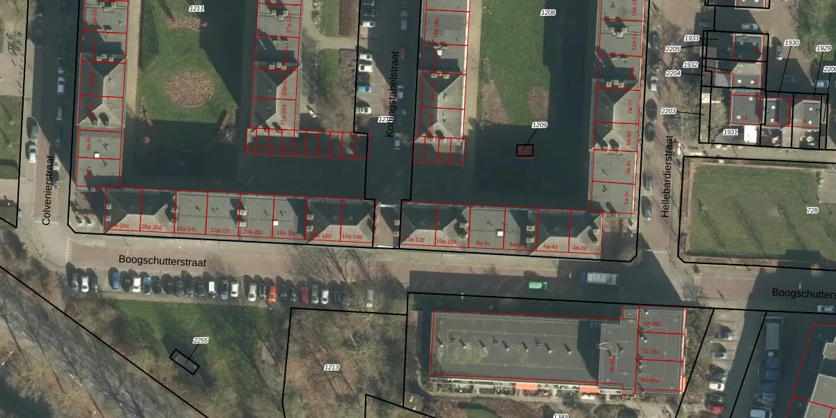 Het perceel waarop Boogschutterstraat 12-d staat heeft een oppervlakte van 6311 m². Dit is een zeer groot perceel. De perceeloppervlakte wordt geregistreerd door het Kadaster. Gedetailleerde informatie over de maten van dit perceel kunt u vinden in het rapport Kadastrale kaart met maatvoering van Boogschutterstraat 12-d.