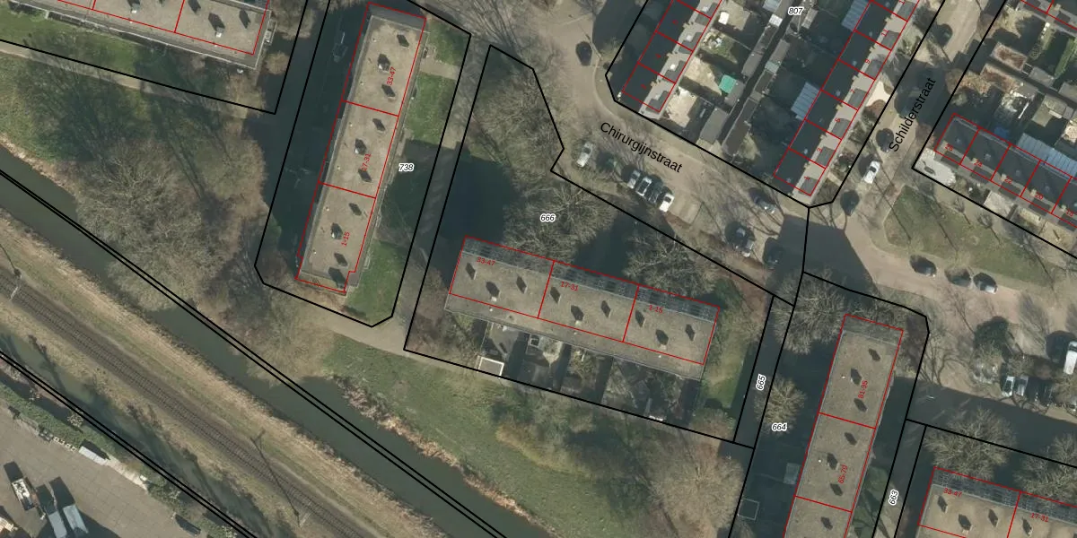 Het perceel waarop Chirurgijnstraat 39 staat heeft een oppervlakte van 2507 m². Dit is een zeer groot perceel. De perceeloppervlakte wordt geregistreerd door het Kadaster. Gedetailleerde informatie over de maten van dit perceel kunt u vinden in het rapport Kadastrale kaart met maatvoering van Chirurgijnstraat 39.